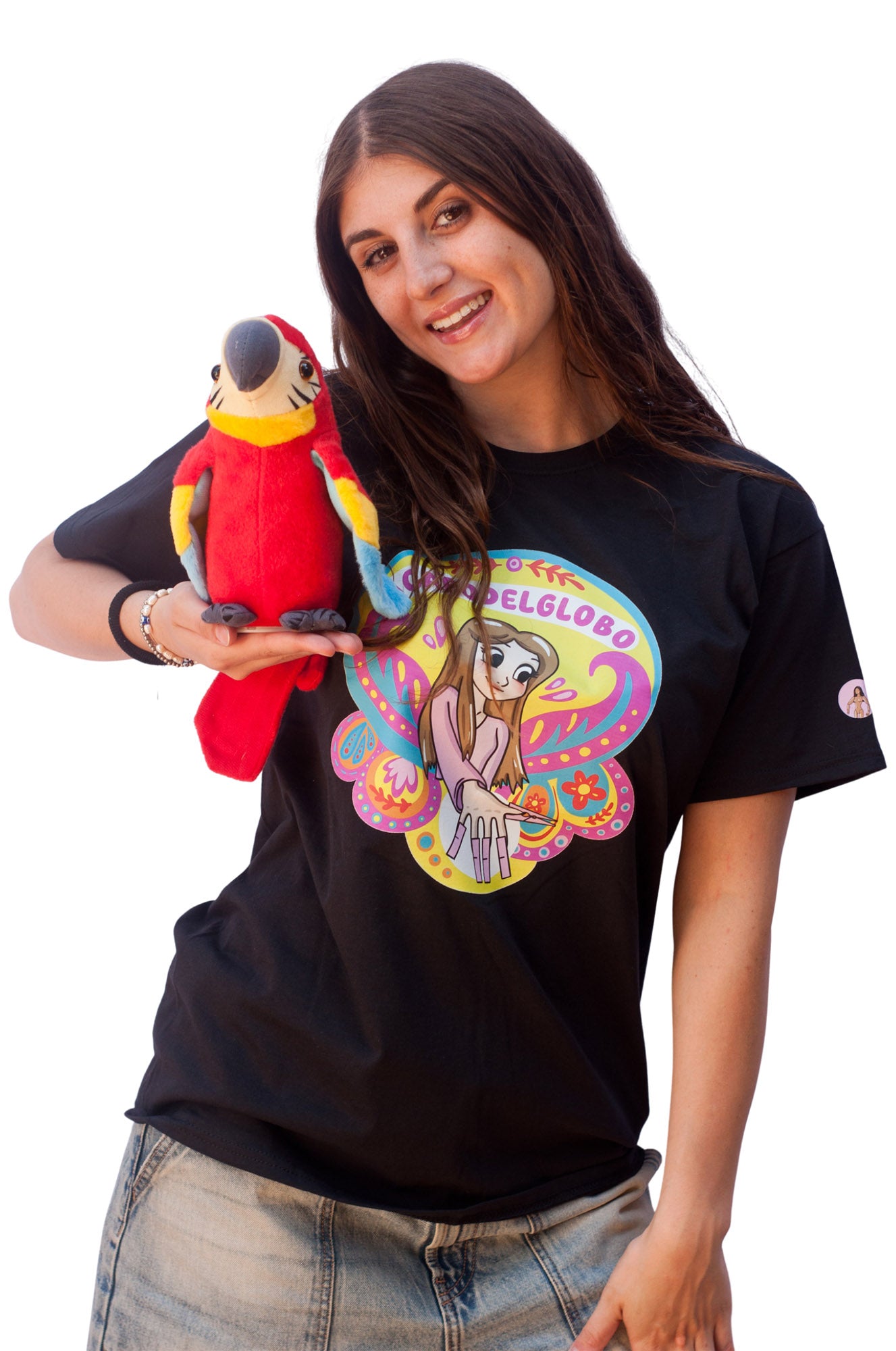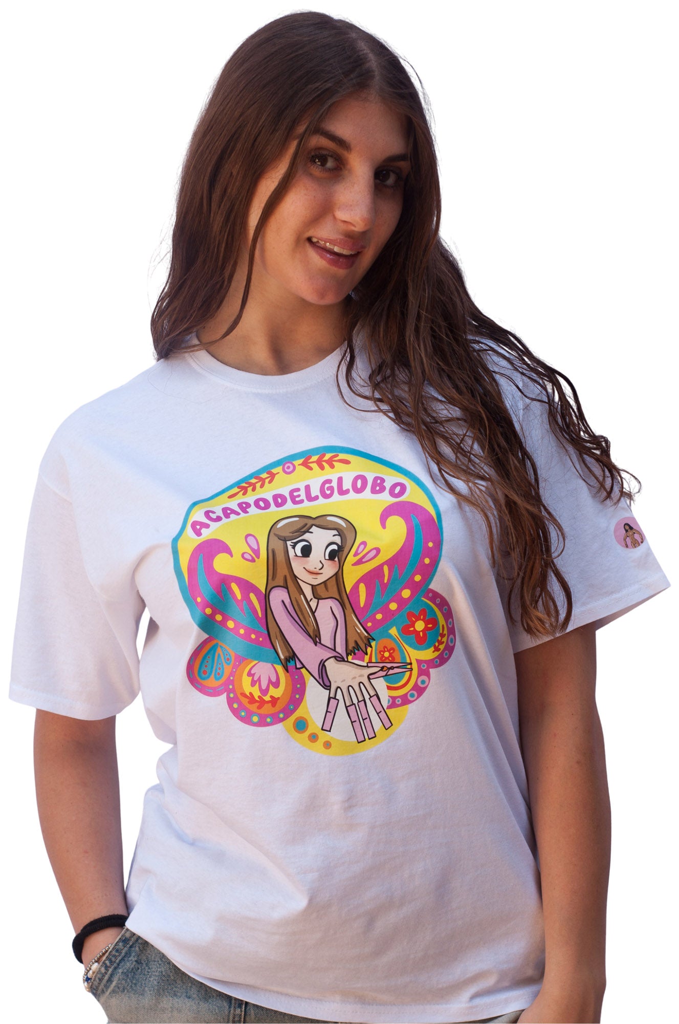 T-shirt con grafica in stile giocoso e femminile su uno sfondo vivace e coloratissimo a forma di farfalla, con motivi floreali e pop e la scritta “ACAPODELGLOBO”.
